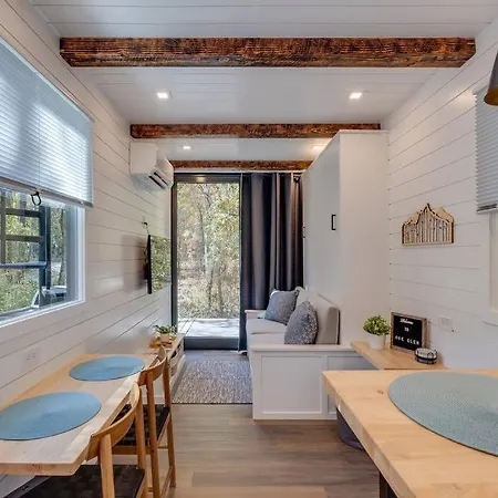 The 1-bedroom New - Oak Glen Microcabin - Rare Broken Bow villa offers guests a relaxing experience with a hot tub.